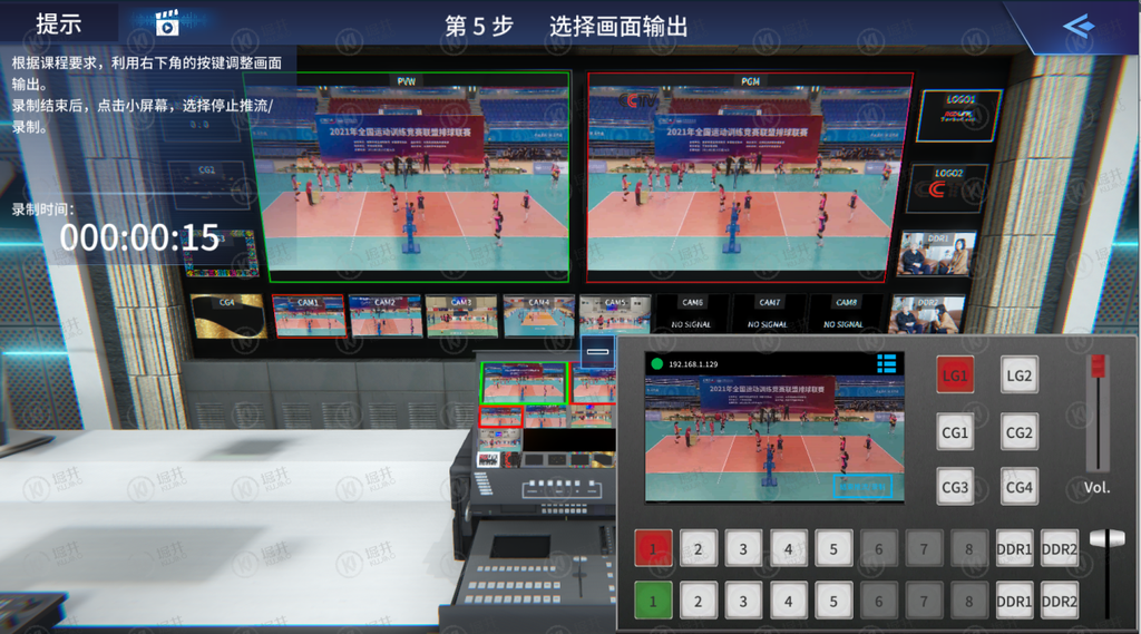 运用虚拟仿真实验技术,学习体育赛事中多讯道导播的的操作方法。通过给予不少于5个不同讯道的视频信号,让学生根据比赛进行中发生的各种精彩镜头和突发事件、特写等情景切换不同的导播讯号进行播出。完成虚拟实验操作和模拟考试,通过后台计分系统,评估学习效果。